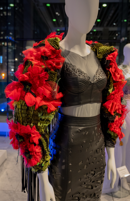 This look represents life and death, happiness and loss. A bright poppy cape with smocking pleated flowers feels alive and full of movement, while the black laser-cut skirt and top show fading petals. The red and black contrast symbolizes the transition from bloom to memory.